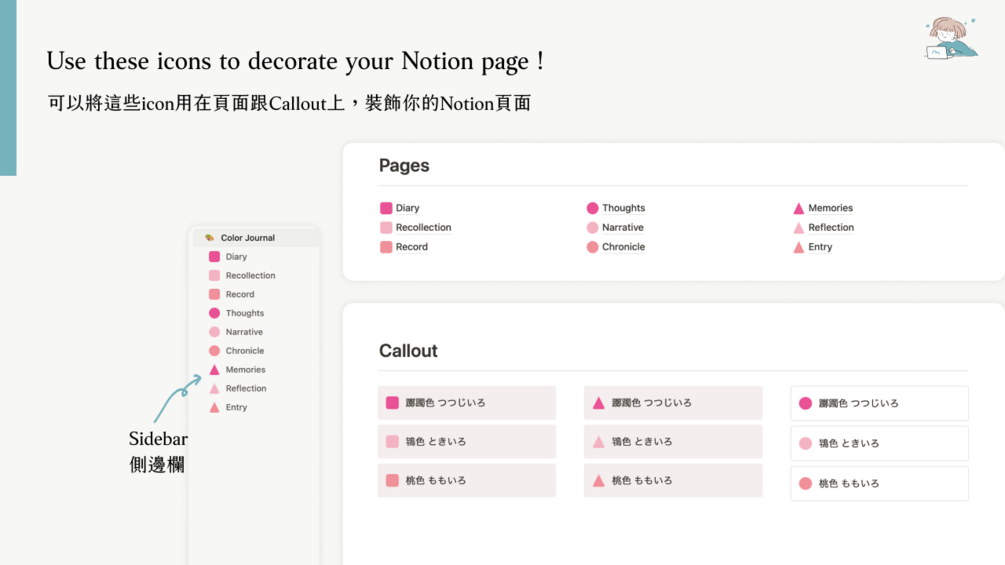 側邊欄和頁面裝飾: 可以將這些icon用於Notion的側邊欄和頁面以及callout區塊