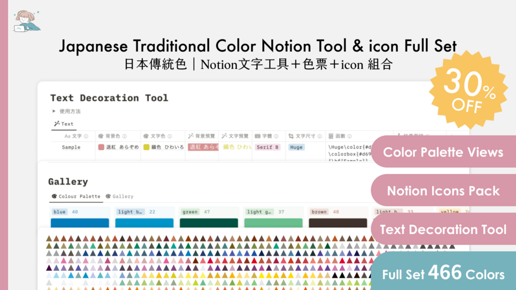 466 Colors|Japanese Traditional Color Set 日本傳統色|Notion文字工具+色票+icon 組合